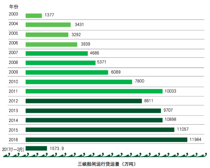 投入運行以來,三峽船閘過閘貨運量逐年遞增,2011年首次突破億噸,提前19年達到設(shè)計能力。2014年至2016年連續(xù)3年貨運量突破億噸。截至2017年3月7日,三峽船閘累計運行12.87萬閘次,過船73.1萬艘次,通過旅客1181.5萬人次,貨運量10.01億噸。