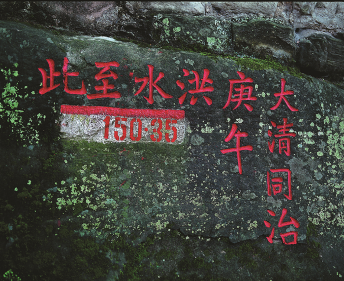 此題刻為云陽(yáng)縣令所刻,后經(jīng)長(zhǎng)江委歷史洪水調(diào)查時(shí)測(cè)定并補(bǔ)刻洪水高程“150.35”)