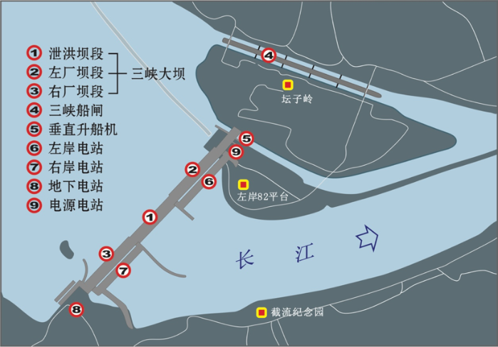 從長江左岸至右岸三峽樞紐建筑物的布置是:三峽船閘,垂直升船機(jī),左岸非溢流壩段和電源電站、左岸電站,泄洪壩段,右岸非溢流壩段和右岸電站,右岸地下電站。