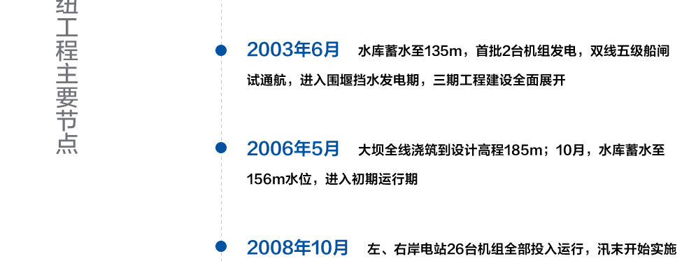 三峽樞紐工程從1993年1月開始施工準(zhǔn)備,至2008年10月右岸電站機(jī)組全部投產(chǎn)發(fā)電,經(jīng)過16年的努力,除批準(zhǔn)緩建的升船機(jī)外,提前一年完成初步設(shè)計建設(shè)任務(wù)。