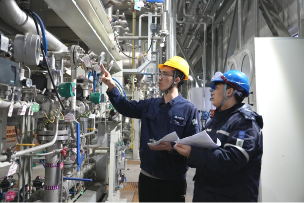 ▲ 在制氫生產(chǎn)車間,工作人員仔細(xì)檢查設(shè)備管路、接口密封性,及時(shí)做好設(shè)備維護(hù),全力保障復(fù)工復(fù)產(chǎn)期間綠氫產(chǎn)能穩(wěn)步爬坡。攝影:王麗曼